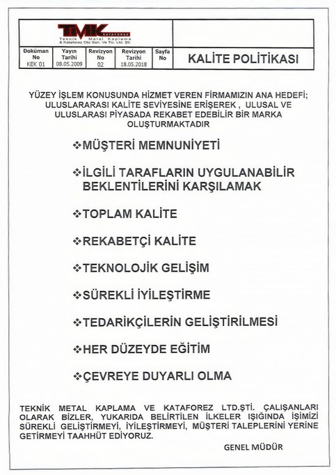 Firmamız çevre sağlığına önem vermektedir. Bu amaçla kimyasal arıtma tesisismiz olup doğaya ağır metal içeren atıksu vermemekteyiz. Ayrıca firmamız Çevre ve Şehircilik Bakanlığı tarafından 2872 sayılı Çevre kanunu gereginçe hazırlanmış Çevre İzin ve Lisan Yönetmeliği kapsamında Çevre İzin Belgesi almıştır.