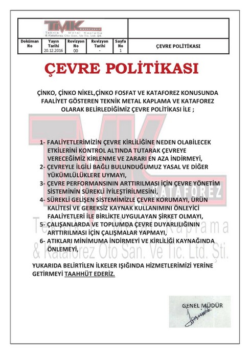 Firmamız çevre sağlığına önem vermektedir. Bu amaçla kimyasal arıtma tesisismiz olup doğaya ağır metal içeren atıksu vermemekteyiz. Ayrıca firmamız Çevre ve Şehircilik Bakanlığı tarafından 2872 sayılı Çevre kanunu gereginçe hazırlanmış Çevre İzin ve Lisan Yönetmeliği kapsamında Çevre İzin Belgesi almıştır.